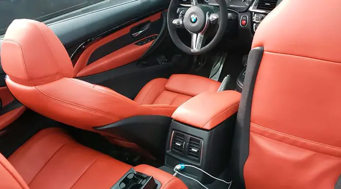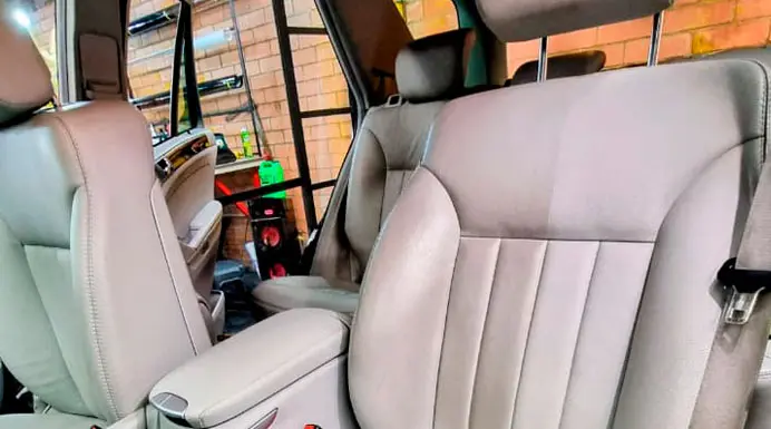 Limpieza de asientos en tela y cuero, 5 puestos usando productos biodegradables, seguros para cada superficie, incluye hidratación para superficies en cuero.